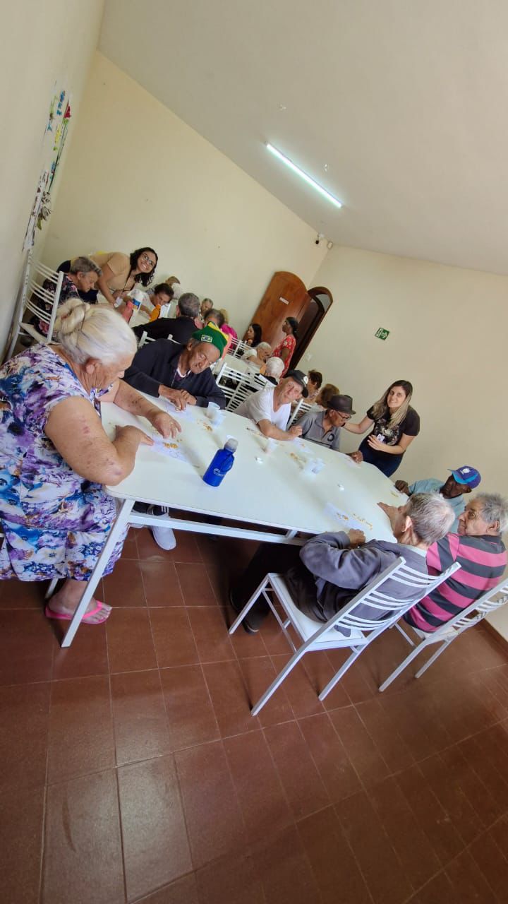 Uma das ações realizadas foi a confecção de girassóis, usando milho de pipoca e sementes de girassol, em uma atividade que, além de ser criativa, estimulou as funções cognitivas e motoras dos participantes. Durante essa atividade, os atendidos foram incentivados a refletir sobre o que os faz felizes e os motiva a viver, promovendo um diálogo aberto sobre seus sentimentos. As respostas foram registradas em um varal simbólico, reforçando a importância da expressão e da valorização emocional.